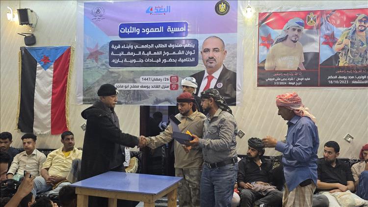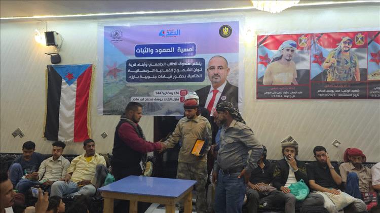 في أمسية رمضانية تحت شعار "الصمود والثبات" نظم صندوق الطالب الجامعي لأبناء قرية ثوان الشموخ الفعالية الرمضانية الختامية المشتركة لقرى سهم النجدي لنجود ثوان الصومعة مهنان عراعر. حضر الفعالية قيادات جنوبية بارزة، برئاسة العميد أبو ماجد الحكم قائد اللواء السابع مشاه.