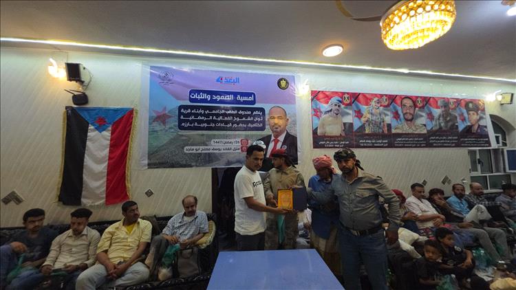 شهدت الأمسية التي قدم فقراتها الأخ مروان عبدالحكيم إلى كلمات دينية ووطنية وحيزاً من الشعر للشاعر بلعيد أبو بحر الجوبعي، تدعو إلى الثبات والصمود في الوطن وتفويض القيادة للرئيس عيدروس الزبيدي والمجلس الانتقالي الجنوبي.