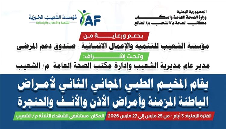 أعلن مستشفى الشهداء الثلاثة بمديرية الشعيب عن انطلاق أعمال المخيم الطبي المجاني، صباح غدٍ الثلاثاء الموافق 24 مارس 2026، والذي يأتي بتمويل ورعاية كاملة من صندوق مرضى الشعيب، وتحت إشراف السلطة المحلية ومكتب الصحة بالمديرية.