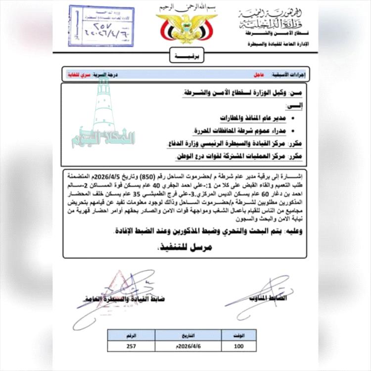 كشفت وثيقة رسمية صادرة عن وزارة الداخلية اليمنية، اليوم الاثنين، عن توجيهات أمنية سرية بالبحث والتحري والقبض على ثلاثة من قيادات المجلس الانتقالي الجنوبي في ساحل حضرموت.