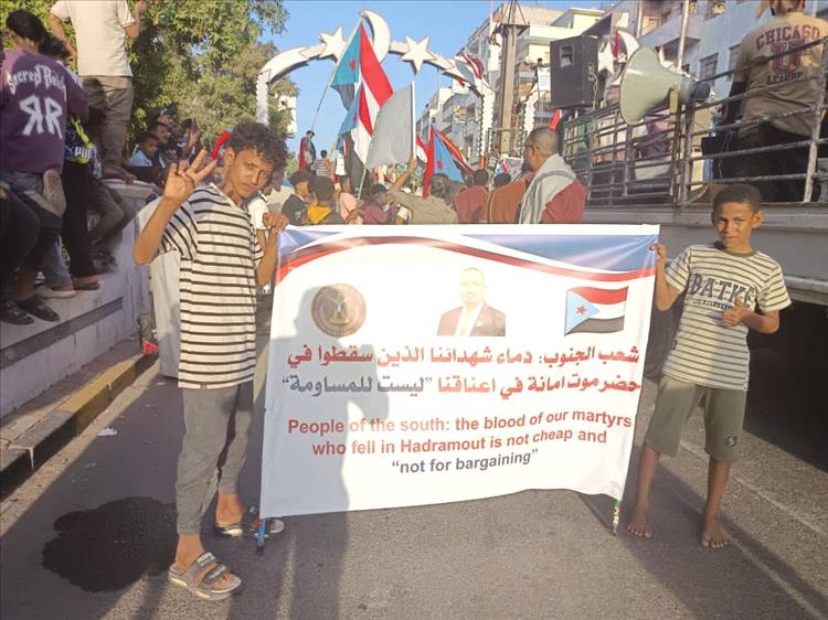 استجابةً لدعوة القيادة المحلية للمجلس الانتقالي الجنوبي في العاصمة عدن، خرجت مسيرة جماهيرية تضامنية للتنديد بما يتعرض له أبناء حضرموت من أعمال قتل وتنكيل واعتقال من قبل سلطات الأمر الواقع، معبرةً عن تضامن أبناء العاصمة عدن مع أشقائهم في حضرموت ورفضهم لهذه الممارسات.