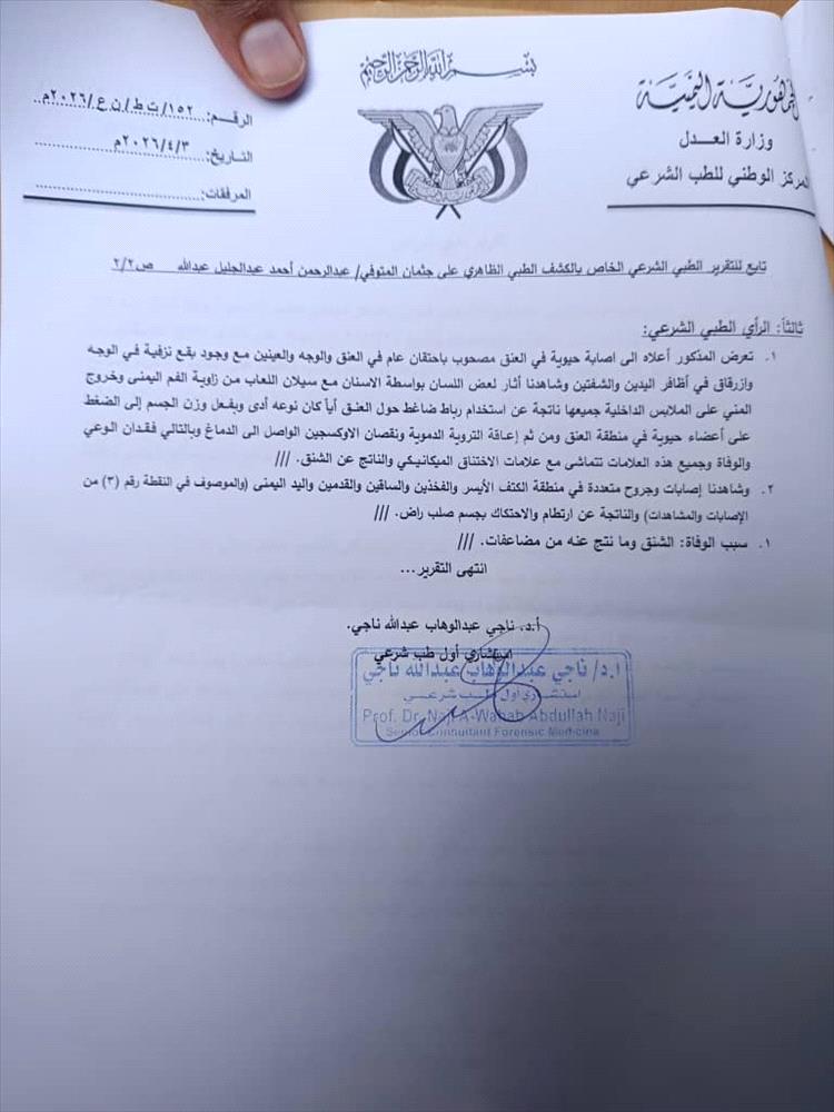 وخلص التقرير بشكل قاطع إلى أن سبب الوفاة هو الاختناق الناتج عن الشنق، مؤكدًا تطابق النتائج مع الرواية التي أشارت إلى إقدام المحتجز على إنهاء حياته داخل مكان احتجازه.