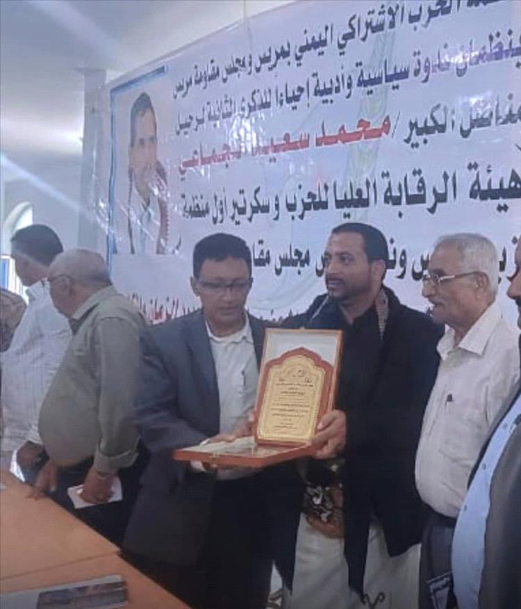 في ندوة فكرية حاشدة أقامتها سكرتارية منظمة الحزب الإشتراكي في مريس"وبالشراكة مع مقاومة مريس" أحيت قاعة كلية النخبة بمدينة الجبارة منطقة مريس مديرية قعطبة الذكرى الثانية لرحيل المناضل والشاعر الشيخ محمد سعيد الجماعي"نائب قائد مقاومة مريس وسكرتير منظمة الحزب الإشتراكي في المديرية"وعضو لجنة الرقابة العليا"