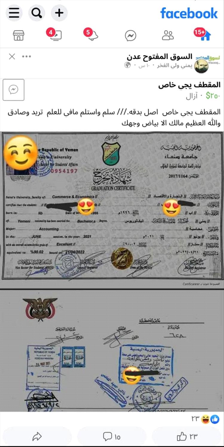ويعرض العديد من سماسرة المسؤولين اليمنيين هذه الشهائد لمحاولة بيعها بشكل سري وحسب طلب المعارف؛ لكن هذه التجارة في الأمانة خرجت عن السيطرة، لتصل إلى ساحة وسائل التواصل الاجتماعي، لتعرض بضاعتها بشكل فج للغاية.