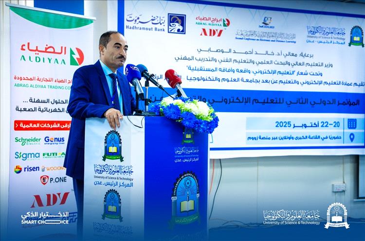 وفي كلمته، أشار وزير التعليم العالي والبحث العلمي أ.د. خالد أحمد الوصابي إلى تجربة جامعة العلوم والتكنولوجيا – عدن في مجال التعليم الإلكتروني والتعليم عن بعد، معربًا عن رغبته في عقد شراكة حقيقية بين الوزارة والجامعة لتنفيذ توصيات مخرجات مؤتمر التعليم الإلكتروني.