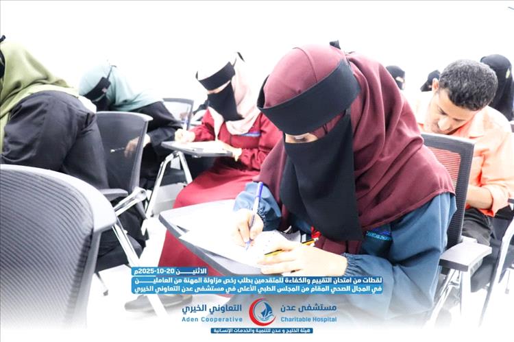انطلقت اليوم في مستشفى عدن التعاوني الخيري بالعاصمة عدن امتحانات التقييم والكفاءة للدورة الامتحانية الأولى التي ينظمها المجلس الطبي الأعلى، بمشاركة (77) متقدماً من حملة البكالوريوس والدبلوم في مختلف التخصصات الطبية.