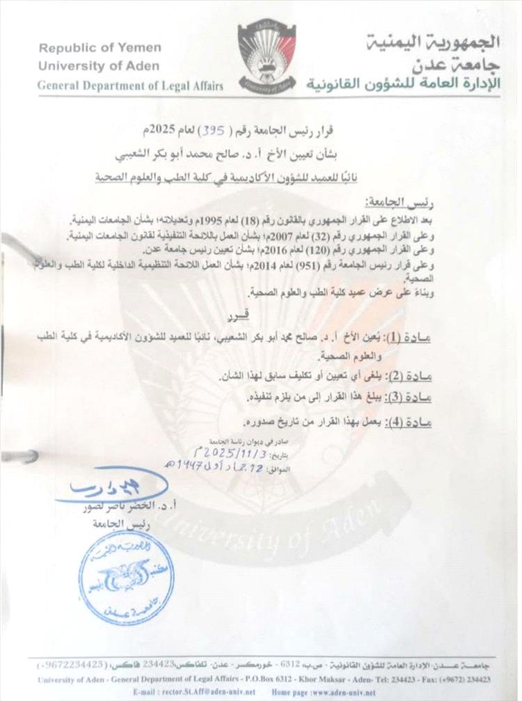 أصدر رئيس جامعة عدن، الأستاذ الدكتور الخضر ناصر لصور، اليوم الأحد الموافق 3 نوفمبر 2025م، القرار رقم (395) لعام 2025م، يقضي بتعيين الأستاذ الدكتور صالح محمد أبو بكر الشعيبي نائباً لعميد كلية الطب والعلوم الصحية للشؤون الأكاديمية.