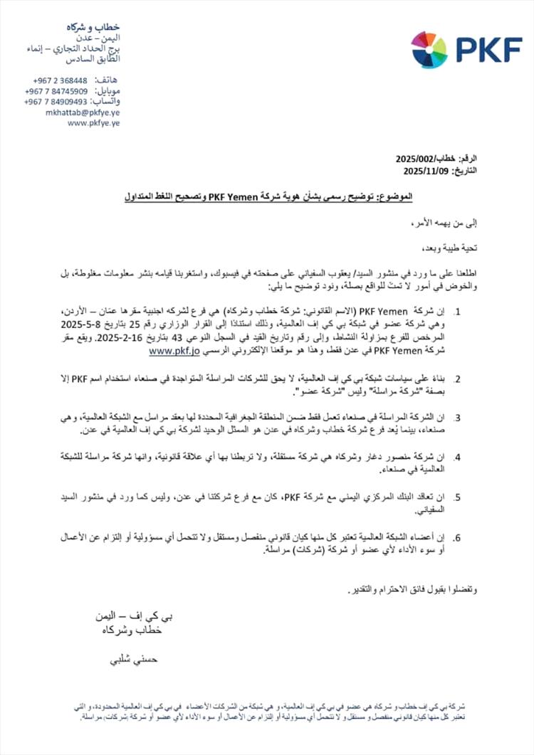 مشيرًا إلى أن الشركات العاملة في صنعاء لا تملك حق استخدام اسم PKF إلا بصفة "شركة مراسلة"، وليس كعضو في الشبكة الدولية.