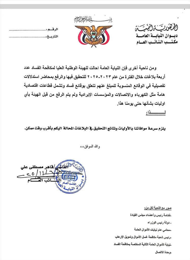 ولفت النائب العام إلى أن النيابة العامة كانت قد أحالت للهيئة الوطنية العليا لمكافحة الفساد خلال الفترة من 2023 – 2025م أربعة بلاغات تتعلق بوقائع فساد في قطاعات اقتصادية وإيرادية هامة، بينها الكهرباء والاتصالات، غير أنه لم يتم استلام أي نتائج أو محاضر استدلال بشأنها حتى الآن.