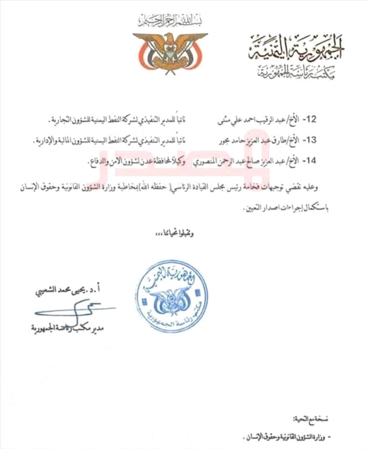 وفي الوثيقة الموجّهة من مدير مكتب رئاسة الجمهورية يحيى الشعيبي إلى رئيس مجلس الوزراء سالم بن بريك، طلب الشعيبي من رئاسة الوزراء مخاطبة وزارة الشؤون القانونية وحقوق الإنسان لاستكمال إجراءات إصدار قرارات التعيين التي تضمنت 14 إسماً في مناصب حكومية ما بين نائب وزير ورئيس هيئة ووكيل وزارة ووكيل محافظة.