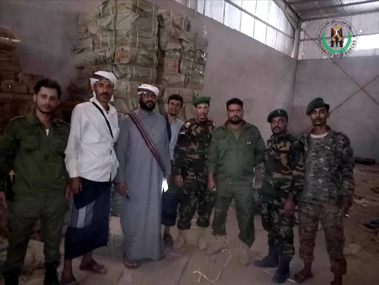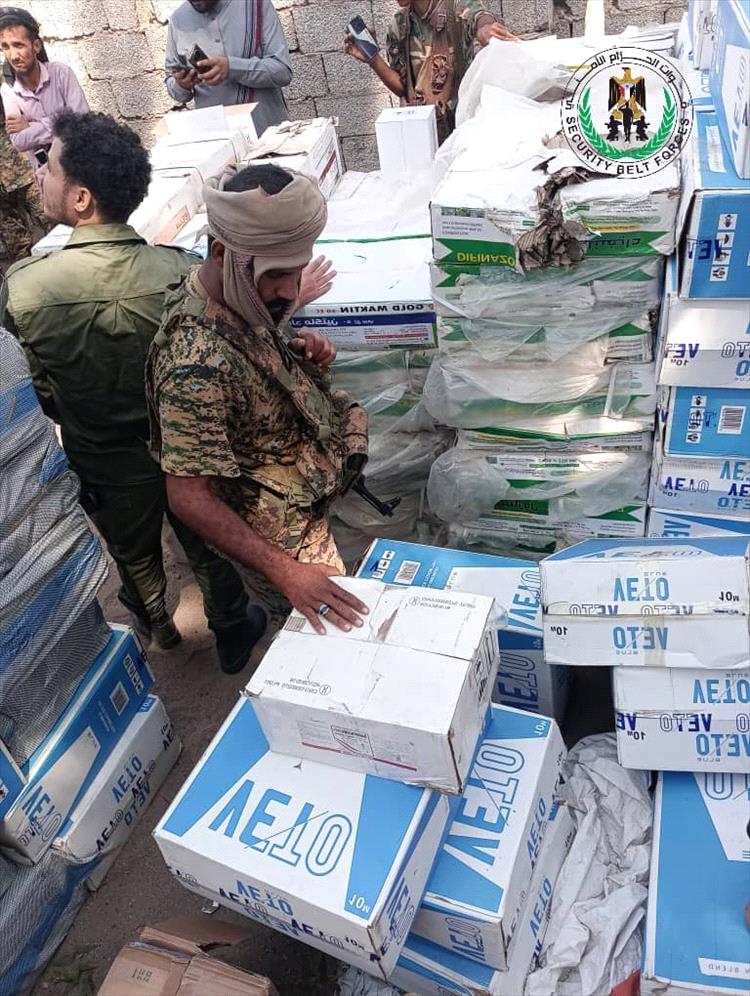 قوات الحزام الأمني بلحج تضبط مخازن لبيع وتوزيع مواد مهربة في منطقتي اللحوم والرباط