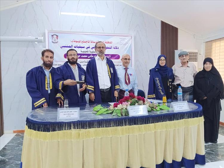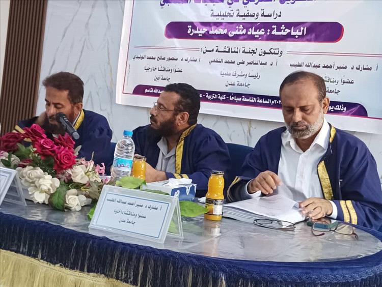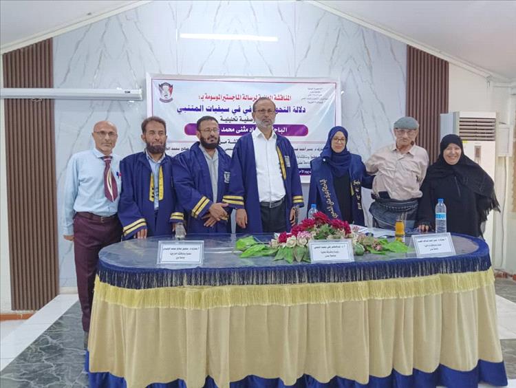 تحت شعار (الصعود إلى القمة)، وفي صباحِ يومِ الأحد الموافق: ٧/ ١٢/ ٢٠٢٥م، وعلى مضْمارِ المجدِ والشموخِ في قاعةِ الفقيدِ، البروفيسور يعقوب عبدالله قاسم، حقَّقتْ - طالبةُ الدراساتِ العليا الباحثة عياد مُثنَّى حيدرة الشعيبي، درجةَ الماجستير بامتيازٍ وتفوقٍ علمي، في صرحِ جامعة عدن، كلية التربية عدن، قسم اللغة العربية، تخصص: (لغويات، نحو وصرف)؛ وذلك في دفاعها عَنْ رسالتها الموسومة بـ (( دلالةُ التَّحويلِ الصَّرْفي في سيفيَّاتِ المُتْنبِّي، دراسة وصفية تحليلية)) ٠