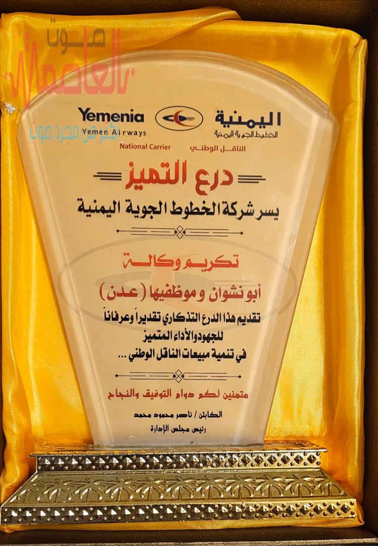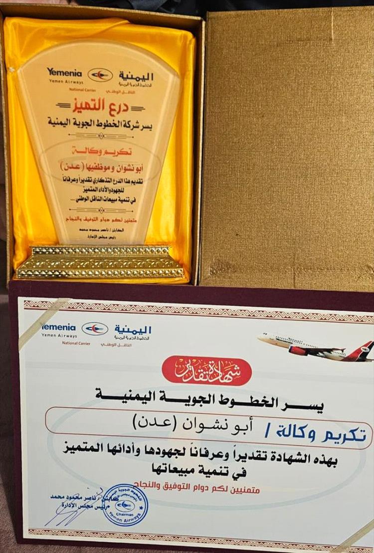 كرّمت الخطوط الجوية اليمنية وكالة أبو نشوان الشعيبي للسفريات والسياحة بـ درع التميز للسنة الثانية على التوالي، وذلك تقديراً لجهودها المتميزة في المبيعات والخدمات.