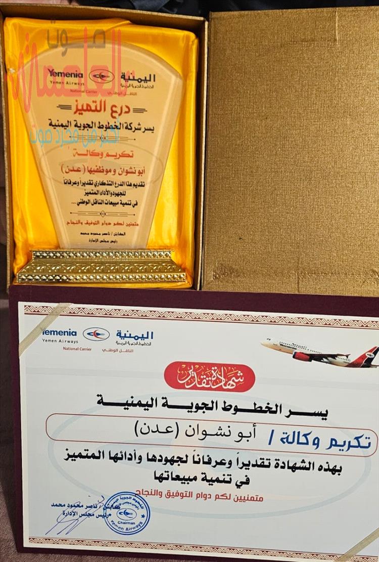 الخطوط الجوية اليمنية تُكَرّم وكالة أبو نشوان الشعيبي بدرع التميز للعام الثاني على التوالي