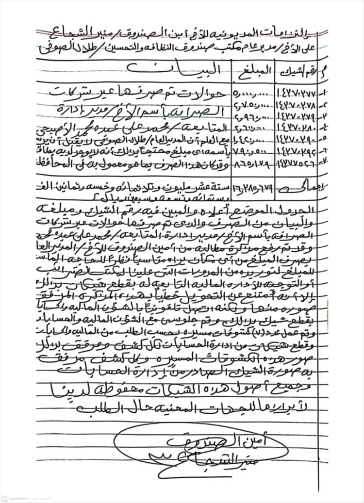 وأظهر إقرار رسمي وخطي من مدير حسابات صندوق النظافة والتحسين، إبراهيم الجعشني، أن الصندوق عليه التزامات مالية لصالح أمين الصندوق السابق تبلغ نحو 40,880,000 ريال، منها 38 مليون ريال مثبتة في الحسابات الختامية للصندوق. كما تشير الكشوف الرسمية إلى أن إجمالي المبلغ 56 مليون ريال ما زال مثبتًا بذمة طلال الصوفي، الذي استولى عليها بشكل واضح، بينما بقيت الشيكات وأصولها بحوزة أمين الصندوق السابق، ما يعكس حجم التلاعب والفساد المالي في إدارة الصندوق.