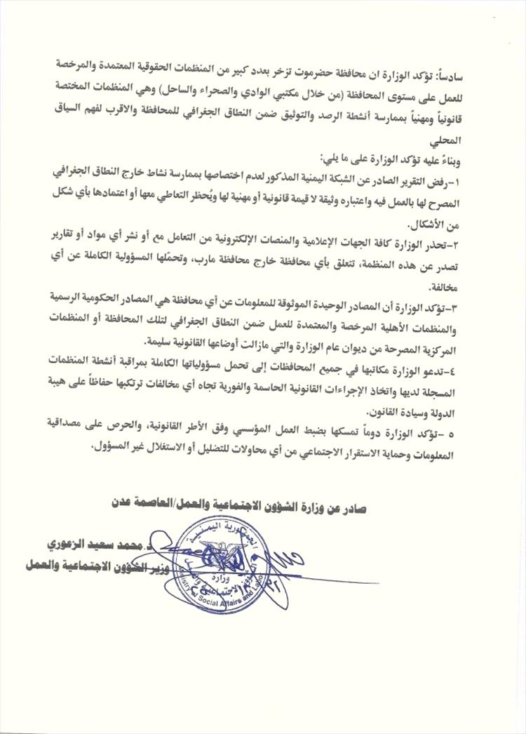 1 - رفض التقرير الصادر عن الشبكة اليمنية المذكور لعدم اختصاصها بممارسة نشاط خارج النطاق الجغرافي المصرح لها بالعمل فيه واعتباره وثيقة لا قيمة قانونية أو مهنية لها ويُحظر التعاطي معها أو اعتمادها بأي شكل من الأشكال.