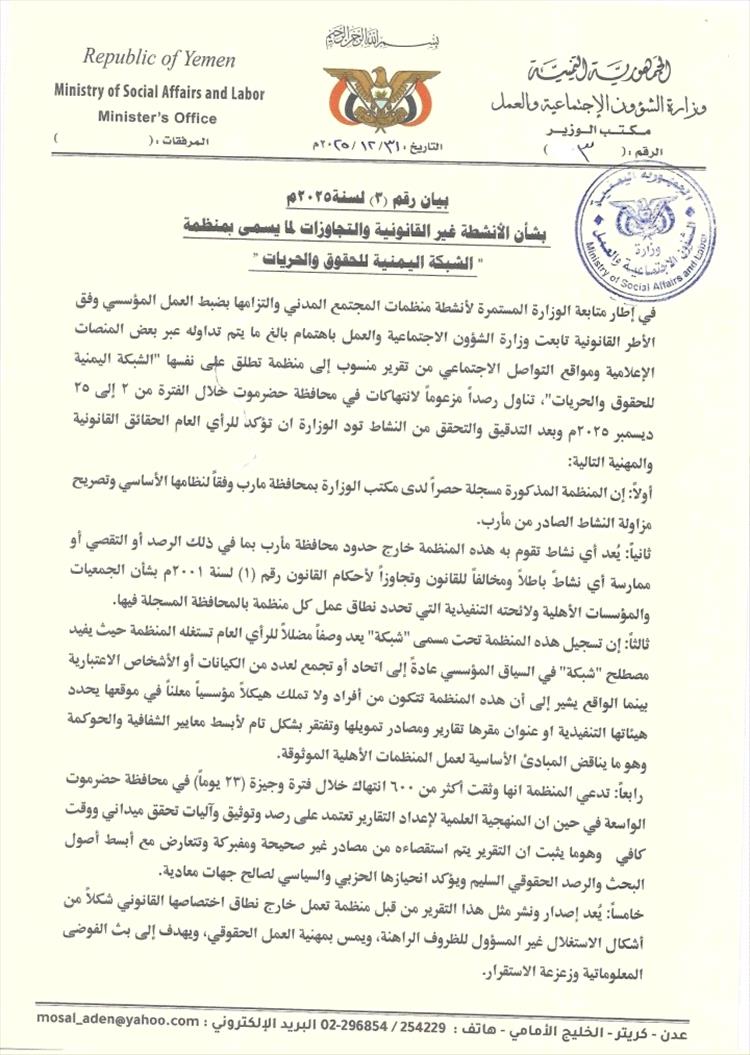 في إطار متابعة الوزارة المستمرة لأنشطة منظمات المجتمع المدني والتزامها بضبط العمل المؤسسي وفق الأطر القانونية تابعت وزارة الشؤون الاجتماعية والعمل باهتمام بالغ ما يتم تداوله عبر بعض المنصات الإعلامية ومواقع التواصل الاجتماعي من تقرير منسوب إلى منظمة تطلق على نفسها "الشبكة اليمنية للحقوق والحريات"، تناول رصداً مزعوماً لانتهاكات في محافظة حضرموت خلال الفترة من ٢ إلى ٢٥ ديسمبر ٢٠٢٥م وبعد التدقيق والتحقق من النشاط تود الوزارة ان تؤكد للرأي العام الحقائق القانونية والمهنية التالية: