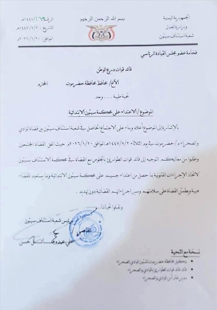 وبناءً على هذا الاعتداء الخطير، أعلنت محكمة سيئون تعليق جلساتها رسميًا، وتم تحرير محضر بالواقعة وقّعت عليه النيابة العامة، إلى جانب رفع برقية عاجلة للجهات العليا والقيادة العسكرية، للمطالبة بوقف الانتهاكات التي طالت القضاة وحرمة المحكمة وهيبة القضاء.