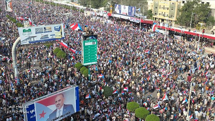 تشهد ساحة العروض بالعاصمة عدن في الأثناء، حشود غير مسبوقة للمشاركة في مليونية الثبات والتصعيد الشعبي.