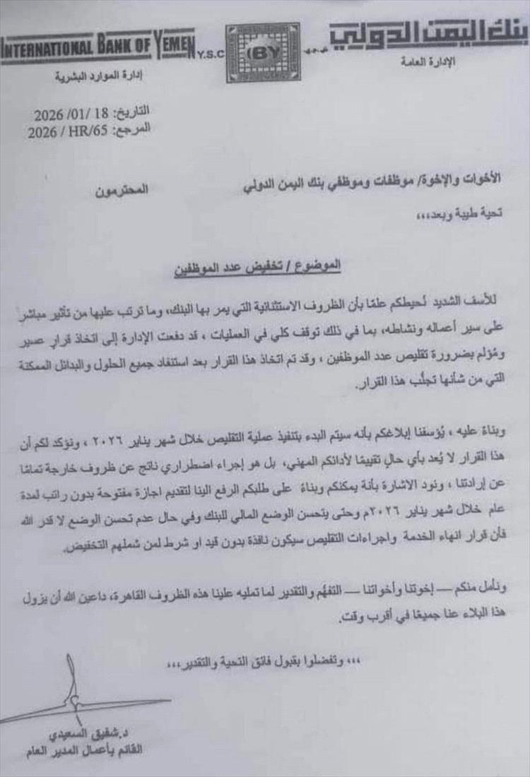 وبحسب وثائق رسمية وإشعارات داخلية صادرة عن إدارة البنك، فقد تم الاستغناء عن ما يقارب ألف موظف، بعضهم أمضى في خدمة البنك ما بين 25 إلى 30 عاماً، دون توفير أي ضمانات قانونية أو حقوق وظيفية، ودون الإعلان عن خطط تعويض أو تأمين بديل.