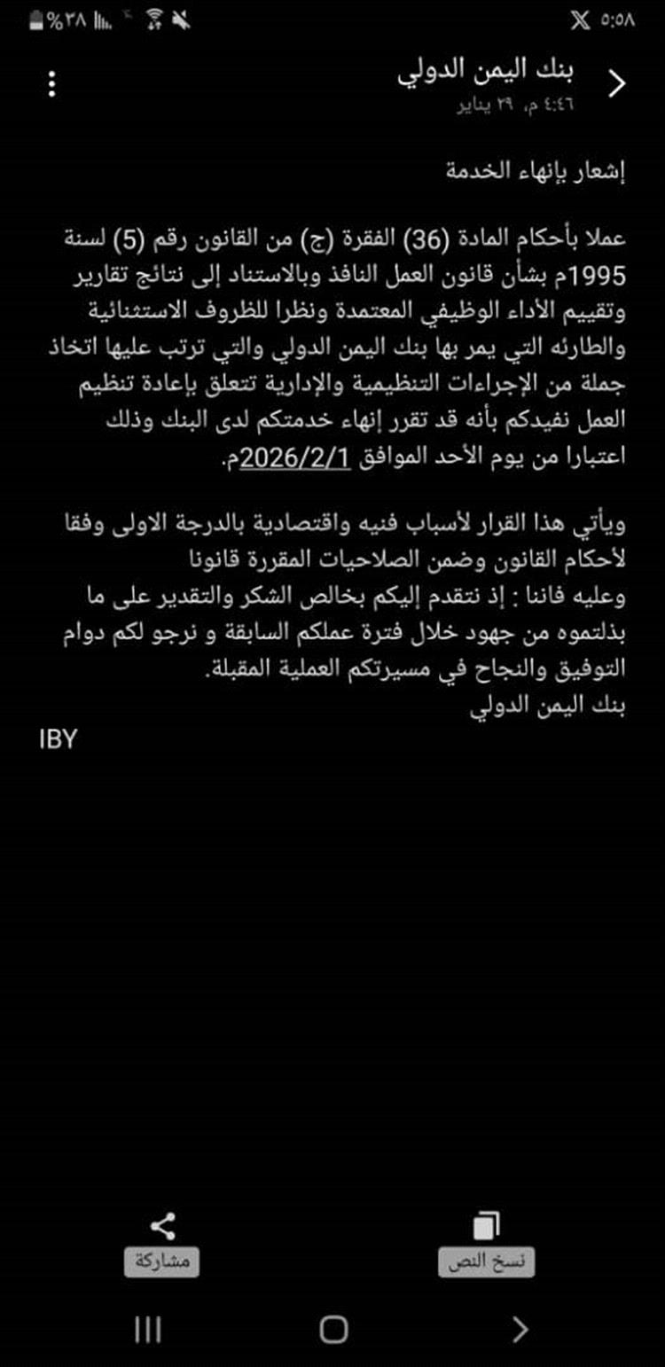 تسريح جماعي لمئات الموظفين في بنك اليمن الدولي بصنعاء "وثائق"
