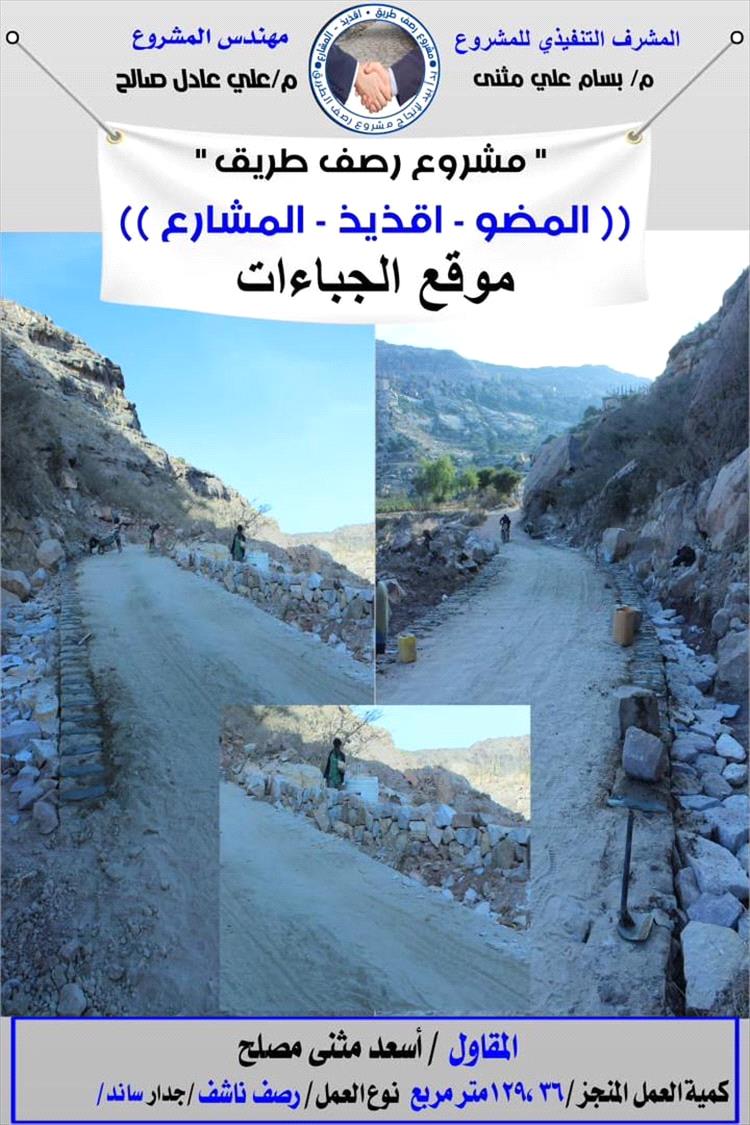 قام صباح اليوم الثلاثاء الاخ روؤف الجعفري بمعية الدكتور محمد ناشر سعيد نائب رئيس المجلس الانتقالي بالمديريه والشيخ مثنى حسين الانعمي نائب رئيس اللجنة المجتمعيه بالمديرية والاخ نجيب احمد قاسم مدير الاشغال العامة والطرقات والدكتور محمد احمد مدير الصحة العامه بالمديرية بتدشين افتتاح مشروع رصف طريق المضو ، اقذيذ ، المشارع بعد استكمال اعمال الرص في الطريق من قبل للجنة المشروع الذي قامت بتنفيذه والمشرفة عليه والذي تمتد من المضو وصولاً الى منطقة اقذيذ والمشارع حيث تم رصف
