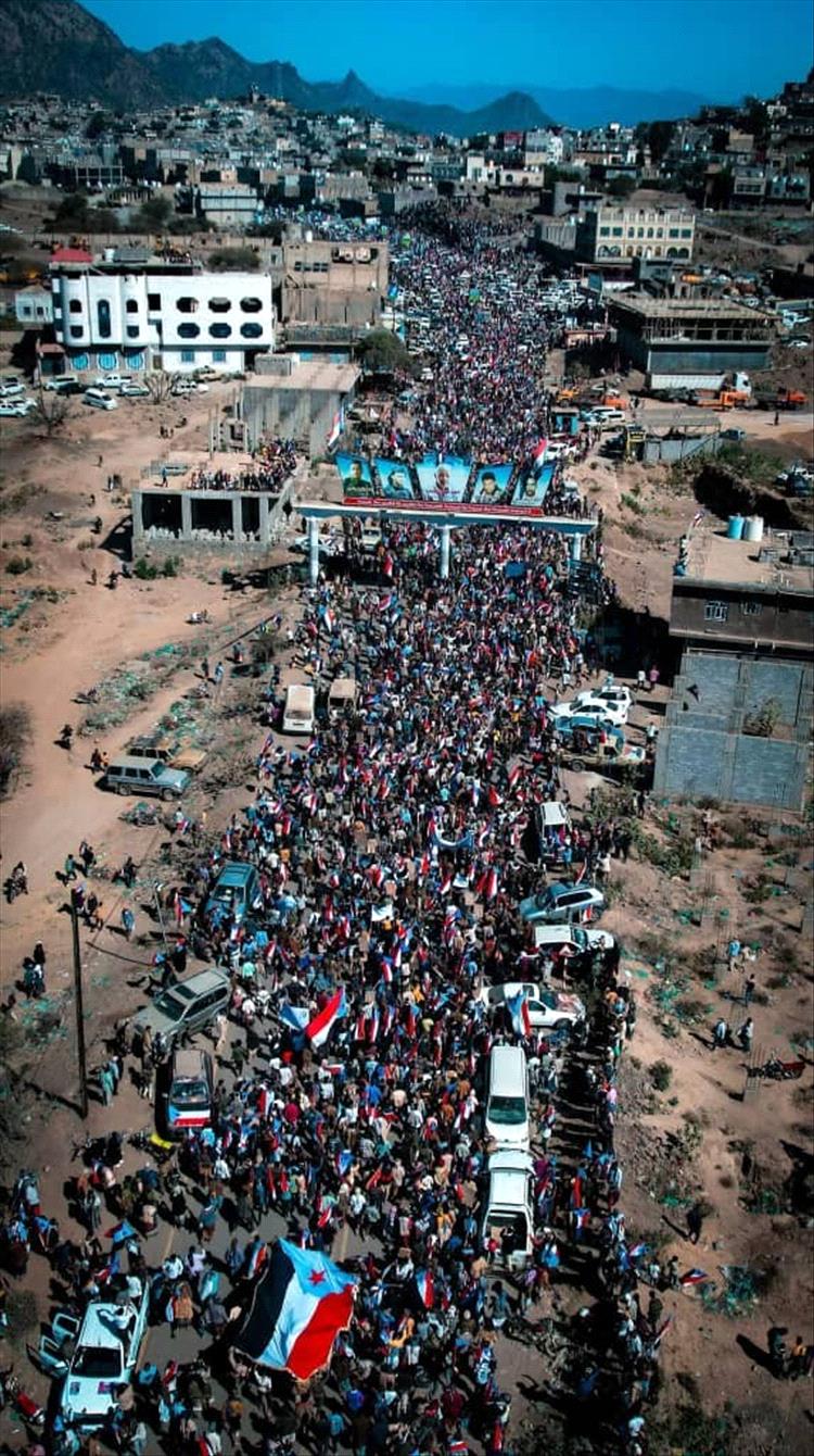 وخرج الحشد الجماهيري عقب ذلك بمسيرة حاشده جابت شوارع عاصمة المحافظة ردد من خلالها الشعارات التي تؤكد تمسك أبناء الجنوب بالرئيس عيدروس بن قاسم الزُبيدي ممثلاً سياسياً ومفوضاً شعبياً، وبالمجلس الانتقالي الجنوبي حاملاً سياسياً معبراً عن إرادة غالبية شعب الجنوب، والإصرار على مواصلة النضال وعدم المساومة أو القبول بإنصاف الحلول، والتمسك بحق الشعب الجنوبي في إدارة أرضه وحماية حدوده بقواته المسلحة الجنوبية.